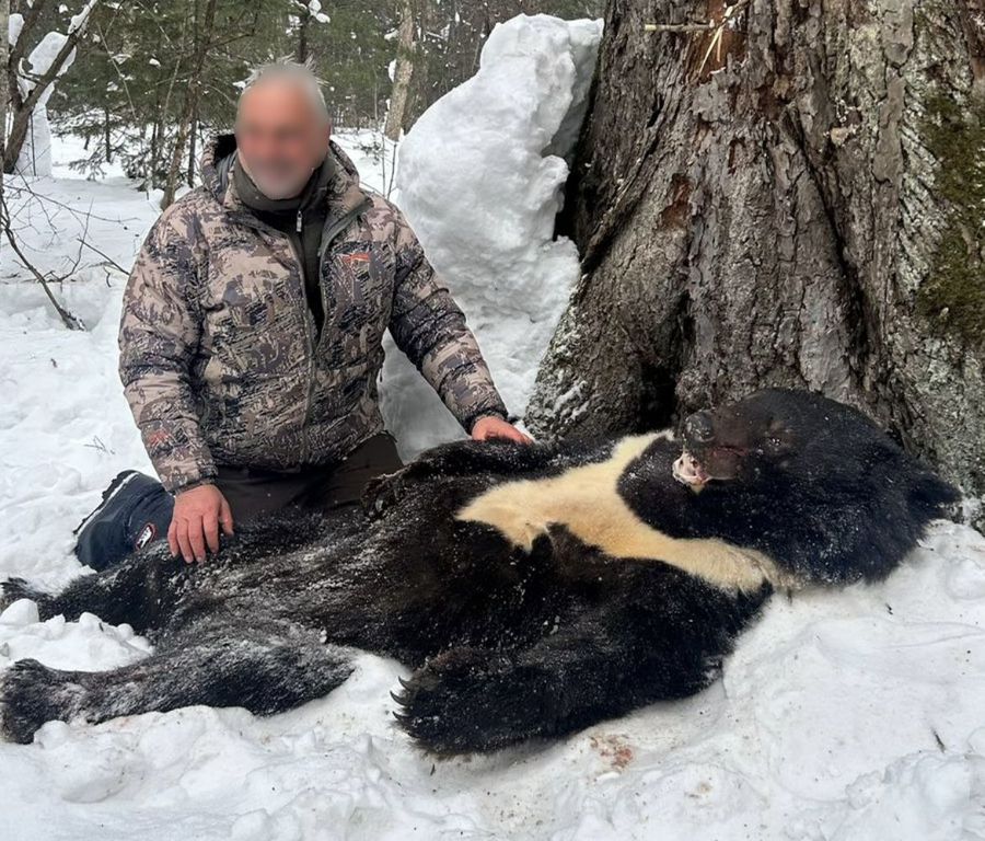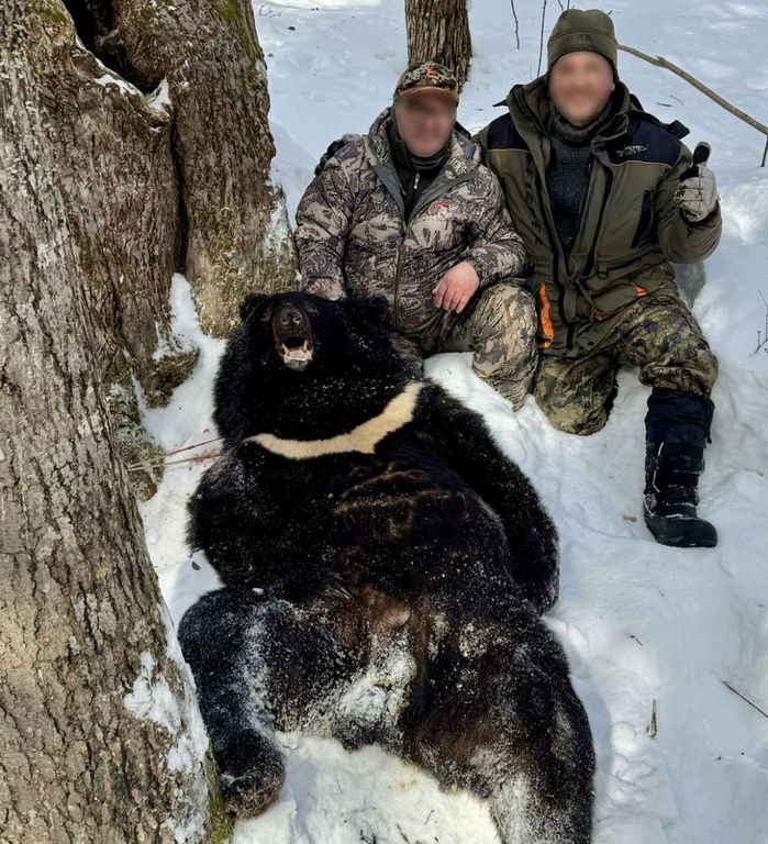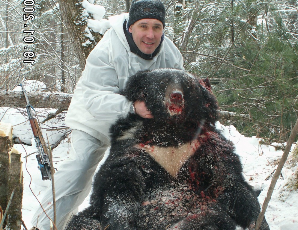 La caza del oso de himalaya se realiza a la huella con motoski, ya que prepara su encame encima de los arboles. Una vez localizado se le hace bajar del arbol para poder cazarlo.